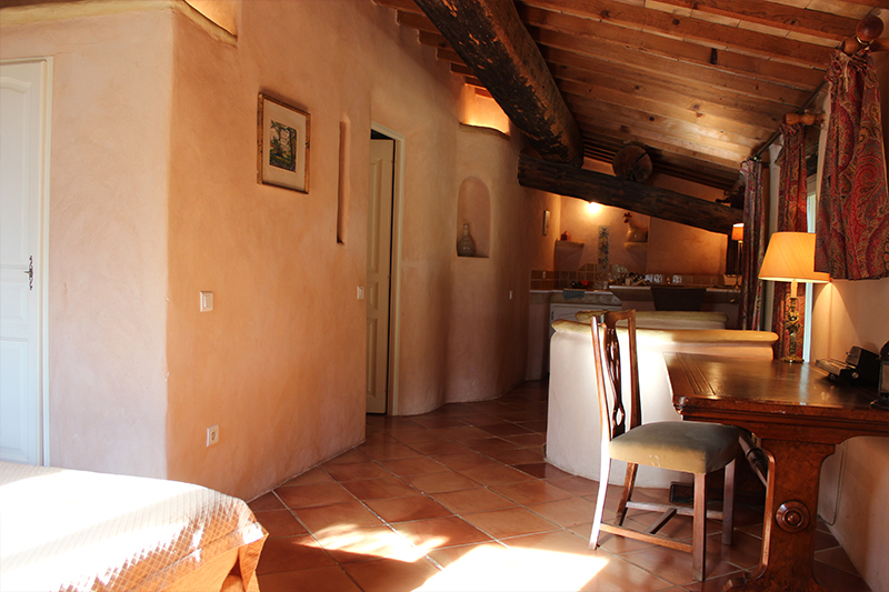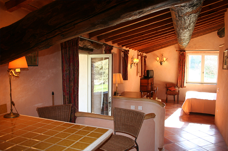 Chambre d’hôtes-studio de 45m2 au Domaine de la Blaque, avec une entrée et une terrasse couverte et indépendante vous plonge dans un cocon intimiste et de charme. Petit déjeuner servi sur place en home service.