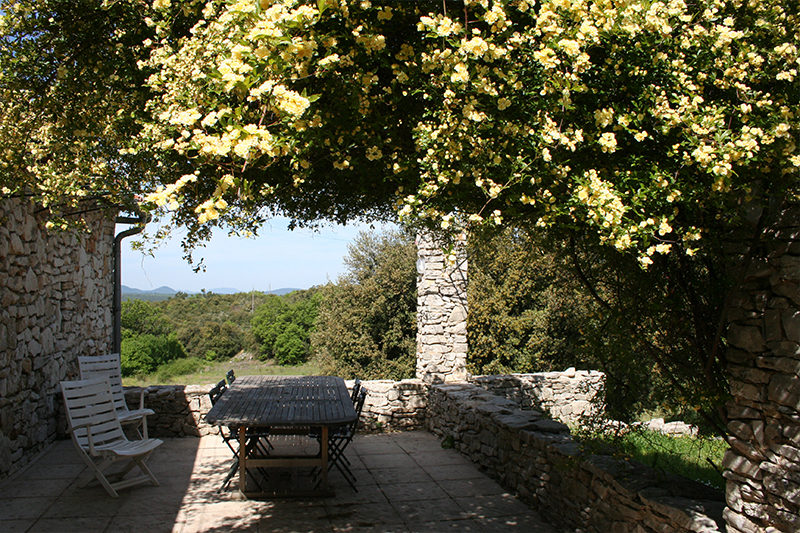 Composée d’une grande terrasse avec pergola avec un salon de jardin et vue splendide sur les collines de Provence.
